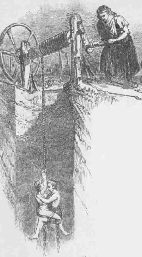 Figure 1.--Here a mother lowers her children down the mine. This was a contempory illustration, I think from the 18th century, but I am not sure who did it or precisely when. |