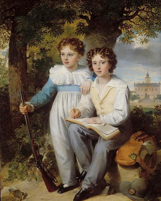 We have found an Ender portrait dated 1837, but without any identification of the two boys. They are presumably Austrian. Google image reserach returned an incorrect reference. They look to be about 7-14 years old. The younger boy has a large ruffled collar, larger than we often see in the 1830s. It looks like the Fauntleroy collars that would appear decades later (1880s). There are matching, but smaller wrist ruffs. This may be a bloue, but wWe are not sure if they were part of a blouse or rather pin on items. But we are not sure. He has a light blue top of some kind, but we are not sure what kind of garment it was. He has high-waisted long pants. They were normally button-on pants in the early-19th century, but we do not see any buttons. It is almost as if the pants waistband was elastisced, but elastic did not yet exist. Could there be inside buttons? It is not clear hw his pants were held up. The child looks rather girlish, perhaps because of the hair, but girls did not wear pants in the 19th century. The musket he is holding further confirms that he is a boy. His older brother has an open Shiller collar, yellow vest, and long pants. There seems to be some kind of leather item on the rock by the older boy, perhaps a book bag. Rhe boys probanly had naturally curly hair. We do not hink the older boy would have had his hair curled.