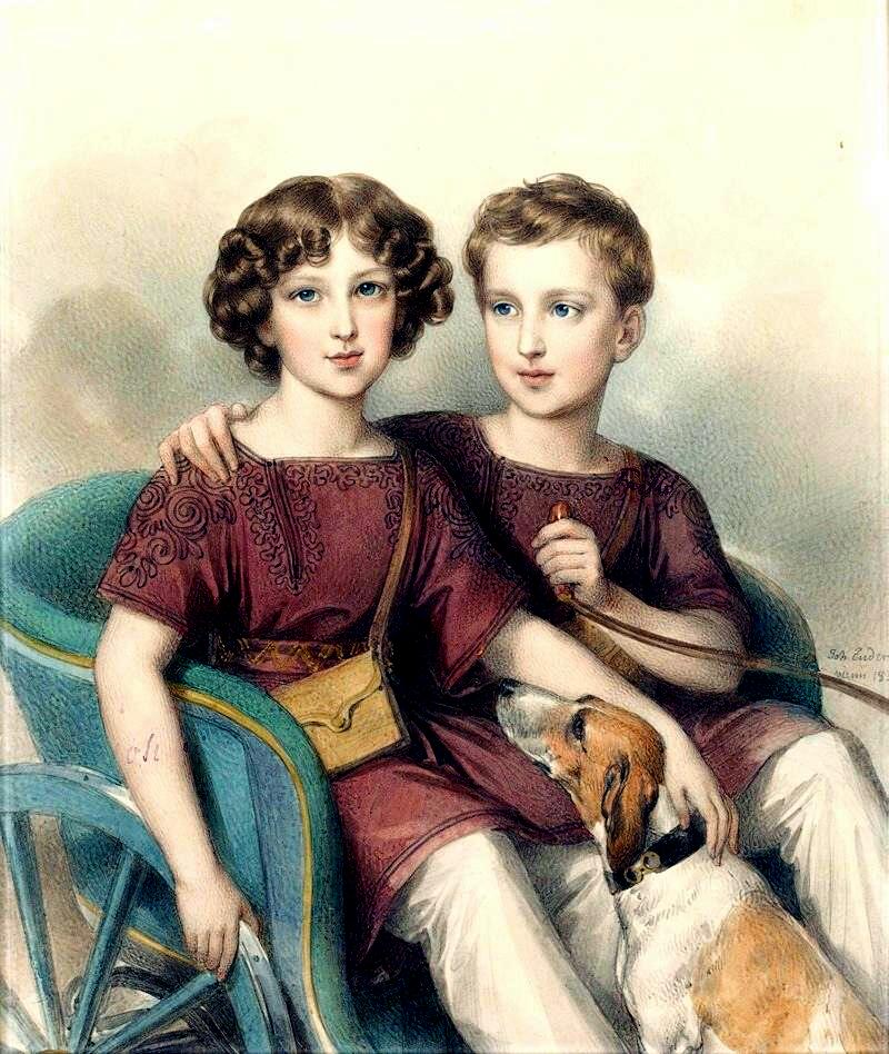 We note several Ender portraits from the 1930s. One Ender portrait was titled 'Mutter und sohn'--mother and son. The family is not identifid, but it looks like a very affluent family.. It is not dated. We might guess it was painted about 1830--but at this time we are omly guessing. The mother dress with the elaborate slleces is the best way to date the image. Notice the boy's open ruffled collar. Notice the classical column and drapes. This popular convention also appared in early CDV portraits. (earlier formats tended to have plain backgrounds.) We notice a portrait of Alfred and Adam Potocki sitting in a carriage (1831) (figure 1). The Potockis were one of the wethiest and imprtant Polish arisocratic families. This continued after World War I with Polish independence (1918). Poland was partioned (19th centyury) and the family played an imprtant role in Austrian politics and society. The boys as was the custom of their mother were dressed alike. They wear square, opened necked maroon tunics with white pants and are pictured with a faithful pooch. Curiously for a mother who dressed them alike did their hair very differently. Amother earler portrat shows hem wearing matching blue tunics.