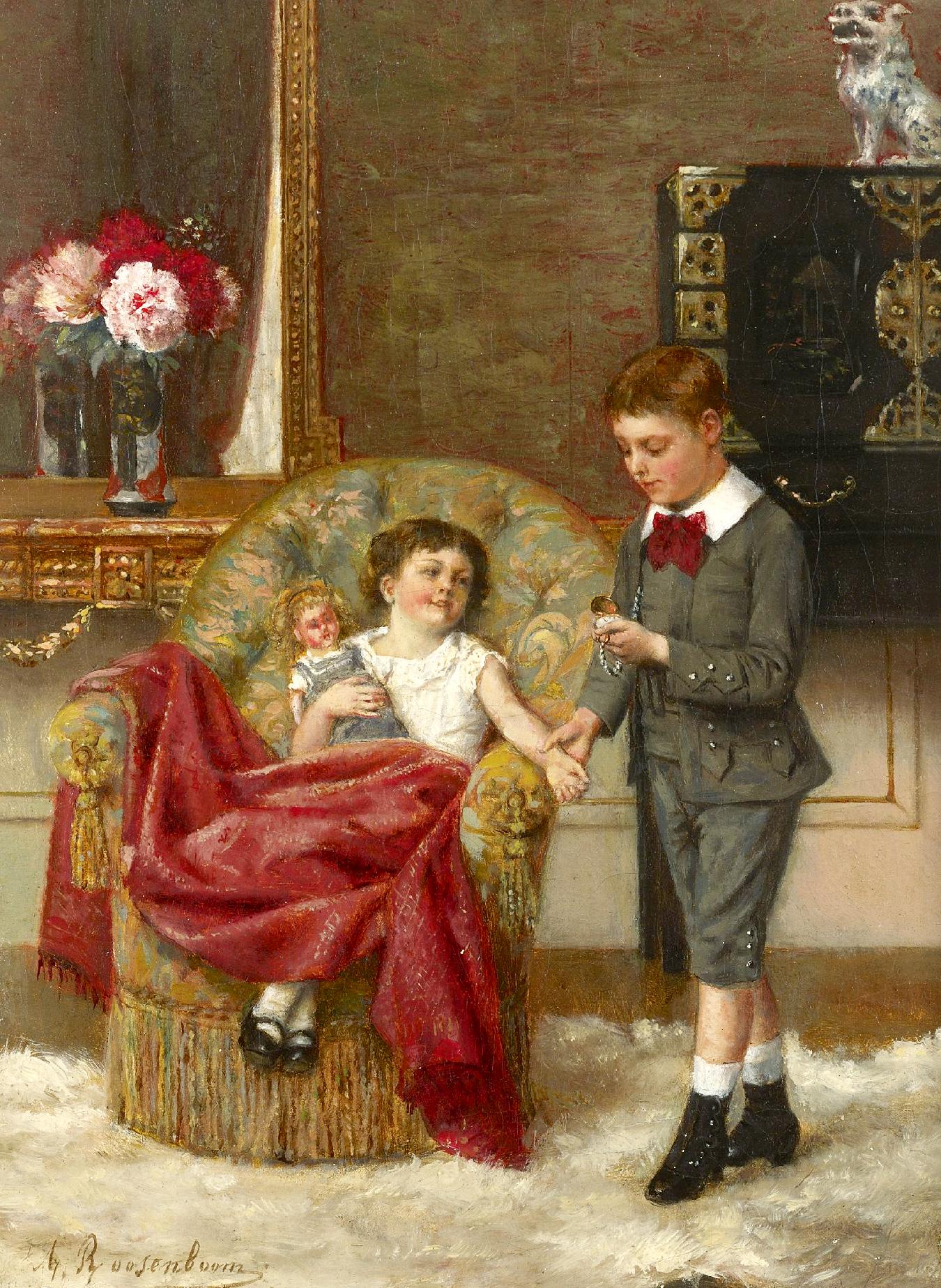 Rosenboom has left us an extensive cultural record, this included not only fashion, but furnidoings and interiors. Our interest of course are the fashions, specifically the children's fashions. And we have a detailed sepiction of children clothes in the late-1860s and early-70s. Almost all the children he painted were pre-teen school age children, both boys and girls. We do not see much in the way of headwear given that so many of his paintings are indoor views, but we do see a few. We do not see any caps. The boys wear rounded-crown hats with streamers. The girls wear a variety of fancy hats. All the boys wear suits, although details on the suit jackets other than the colors are limited. Most of the images show the boys weraring black or navy blue suits. But we do notice other colors. They seem to be collar or near collar buttoning jackets. Many were worn with large white collars including Eton collars. All the boys wear knee pants, mostly with white socks rather than long stockings. And we see a few boys weraing while rather than matching knee pants, presumably a summer style. The girls are seen in fashionable hats and dresses. The girls' headwear is quite varied. We do not see the basic rounded-crown hats that the boys were wearing. Many of the dresses were done without waislinres, A-line styles with some low-wasted decoration.