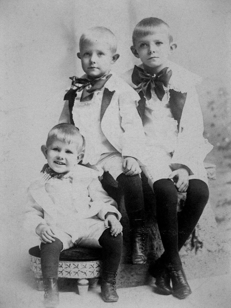 This cabinet card portrait is identified as Mrs. Bett's children. The boys' first names are not given, but they look to be about 3-8 years of age. We see three boys dressed identically in white knee pants suits. They are presumably wummer suits, the dark long stockinfs were common even during the summer. Motice the detinctive dark lapels. All the boys have floppy bows, although not as large as some we have seen at the time. The bows are different and the younger boy's jacket seems a bit different, here we do not see dark lapels. That seems strange, to go to all the trouble to dress the boys identically, but to do the lapels differetly. We have not seen suits quite like this before, especially the dark lapels. Actually, Fauntleroy suits were often done wihout lapels of any kind. A reader writes, "The suits almost looks like satin lapels on a version of a dress suit with modified tails. The outfits may have been for a wedding or some other special occasion."