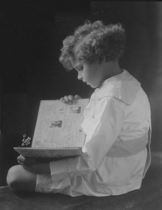 Another outfit shows Billy Blaisdell wearing what looks like a sailor-styled tunic suit. As was common it has long skeeves. This is a beautifuklly posed portrait of him reading a book. We can't tell the type of book, but there are pictures. It is a white suit, but the sailor collar and back flap as well as the wide built have been done in a color for contrast, probanly blue. The matching pants are straight-leg shorts. Here he looks to be about 5-years of age and his curls have been cut, but he has natural curls.