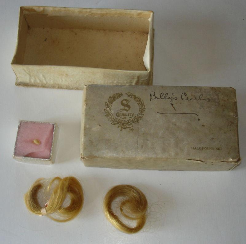 Figure 2.--Here we see some of the momentos Billy's mother kept. Here is the lovingly preserved locks of her son's long blond hair and his first baby tooth in a chocolate box labeled "Billy's Curls"