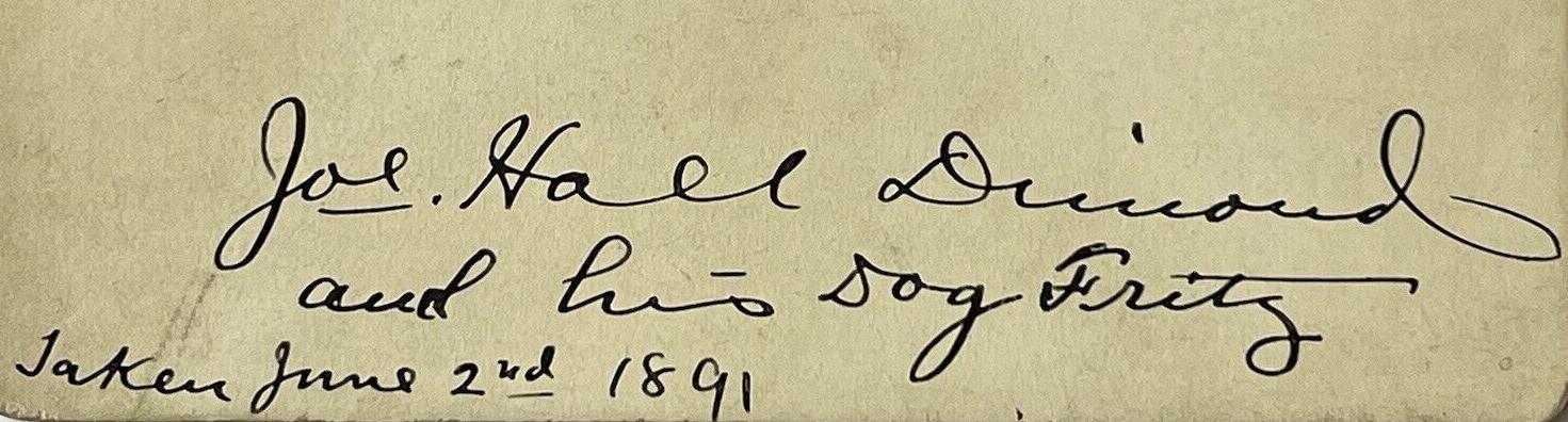 Here we have the boy's name, only we can't make out the writing. The boy's last name is something like Deinoud. We will include a scan of the back of the card in case you care to try to dechiper the hand writing. Notice how very American (meaning English) first and middle names have been chosen to go along wih a foreign sounding family (last) name. Whle he boy's name is a bit hazzy--we do know the wonderful pooch's name--Fritz. We also know when the portrait was taken -- June 2, 1891. Joe looks to be about 5 yaars old. He is wearing a standard cut-away jacket suit and a ilitary-styled peaked cap. It isa a rather plain suit given that the prtrait was taken in the middle of the Fauntleroy craze. Joe does not have a lot of Fauntleroy finery, but does have a floppy bow. The Fauntleroy style as very opukar, but as we see here not every mther bought into the style. It is inteesting hat while mother did nt choose a Funtleroy suit, she did chose rigklet curls. We did not notice at first, but Joe has long ringlets. The ringlets are a the back and mostly not seen. But mother made sure at least one of the ringlets could be seen n teportrait. One is placed on his shoulder. Note that it is a very long ringlet. Often ringlets only came down to the shouders. Joe's tingles fell far below the shoulders. The studio noted 'superior finish'. We are unsure that was something real or just climed as a marketing ploy. We note a lot of American studios claiming special finishes in the 1890s.
