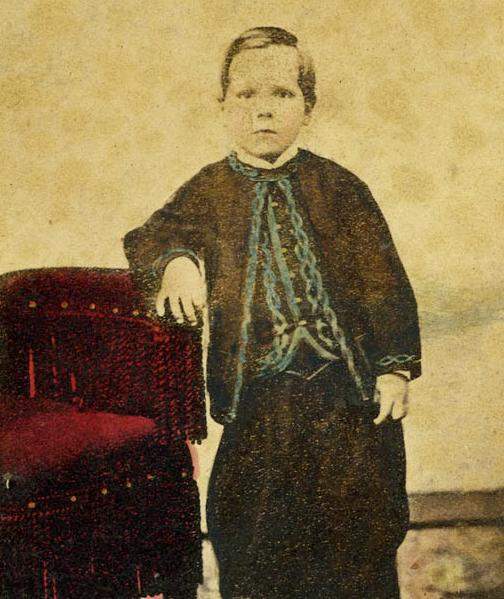 This boy was identified as Walter W. Pond. He looks to be about 7 years old. His name is written at the bottom of the CDV card. This was wear the photographer's name and location was usually printed. The name here is ritten neatly in script. I supose it is possible it was the photographer's name, but the boy's name is more likely. The back is blank. The CDV has been colorized which provides some useful color information. Walter wears a grey cut-away jacket suit. The jacket and vest have blue link trim. The best has blue edging. The pants are heavily bloused like Zouave pants. Walter is seated next to a chair which is colored purple. The portrait is undated, but looks like the 1860s.