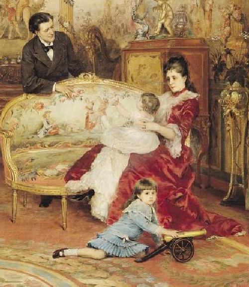 The younger Sardou boy on the right in the Brely portrait is on the floor in front of Mme Sardou and the baby. He is playing with a great toy cannon. It is a toy that any boy woyld give his eye teeth for. I certainly wish I had had on like that when I was a kid. (The Lincoln boys had one like it in the White House. It actually worked and the boys fired it at the President's cabinent!) Even without knowing that the child is a boy, the cannon tells us with consideravle certainty that thechild was a boy. The younger boy is wearing a blue dress with a lace collar and pleated skirt. He wears white socks and black strap shoes. He looks to be about 5 years old.