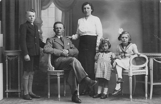 We have a few Belgian family potrraits from the 1930s. We note one prosperous looking unidentified middle-class family, probably taken in the late-1930s just before World War II. There are three children. The boy looks to be about 12-13 years old and wears a dark single-breasted short pants suit with knee socks. Notice the knee socks are a light color and don't match the suit. He has two younger sisters. Both girls wear hair bows. The older girl wears a traditional sailor dress. Both wear white socks. Father wears a smart suit. Mother wears a blouse and skirt rather than a dress. The background is like the ones common in the early-20th century, but we don't see them much much in the 1940s after the War.