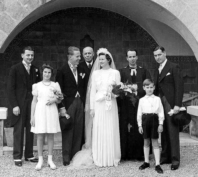 Here we see a formal Anglican wedding in the 1940s, probably after the War. Unfortunately the individuals are unidentified. The wedding party is dressed quite formally.although the bride's dress seems rather plain, perhaps the result of World War II rationing which continued for several years after the War. The men are dressed quite formally, we even see spats and a top hat. This was not a problem for men as their formal dress could be worn for various occassions. A bridal dress had to be made for the special occassion. The flower girl also wears a plain dress. The ring bearer wears a rather plain blouse and velver button-on short pants outfit with white knee socks. He looks to be wearing plain school shoes.