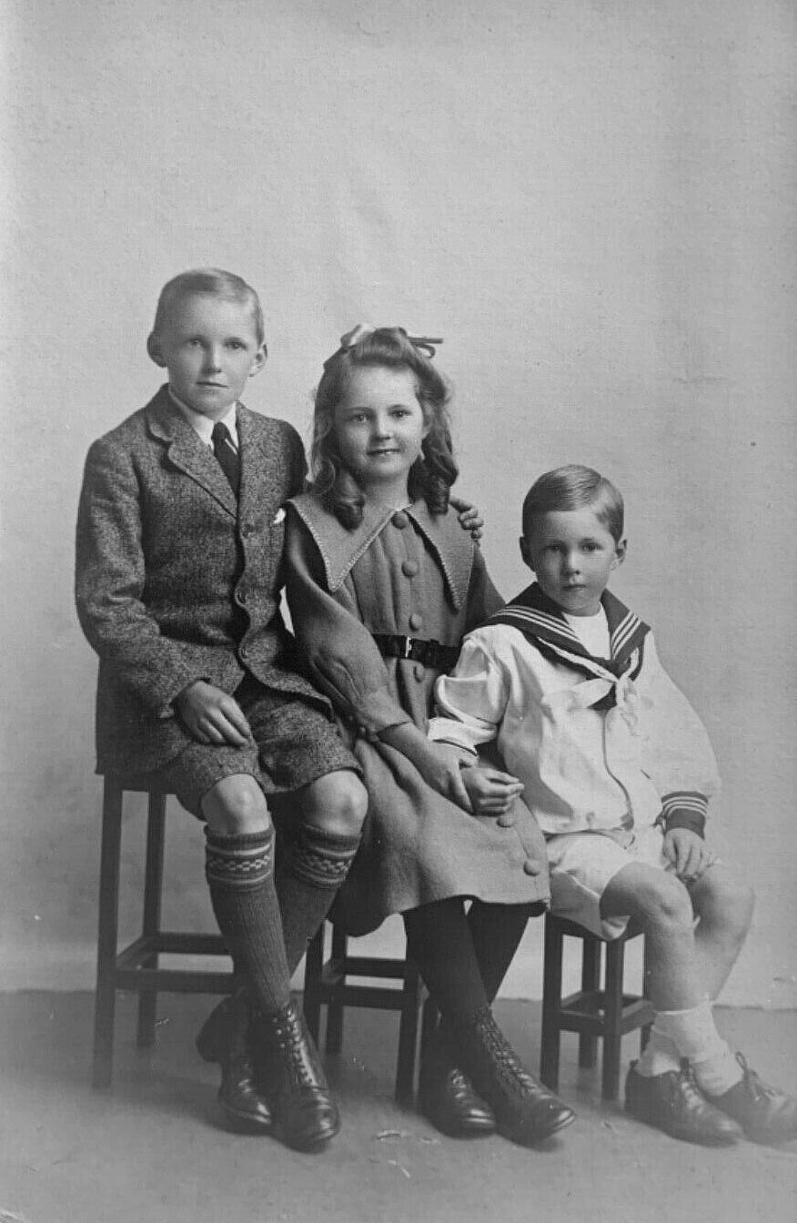 This postcard-back studio portrait shows three unidentified children, two boys and a girl. They look to be about 4-11 years old. They were photographed in Silloth (Silloth-on-Solway), a port town okn the Irish Sea in Cumbria, northern England. The older boys wears a short pants suit with knee socks. The knee socks have the destinctive patterned turn-over-tops popular at the time. Sister wears a heavy winter dress with a large pointed collar and a belt. She has long stockings which persiated as girls' wear a little longer than before boys. Their little brother wears a white short pants sailor suit with white ankle socks. The older children wear high-top shoes. The younger child wears low-cut shoes. The studio photographer was Annie R. Gibb of Silloth. Miss Gibb is known primarily for her touching portraits of servicemen being deployed in World War I. The dealer suggests the portrait was taken 1n 1915. I think that is an estimate, but it does look like it was taken in the 1910s, probably the late or mid-1910s.