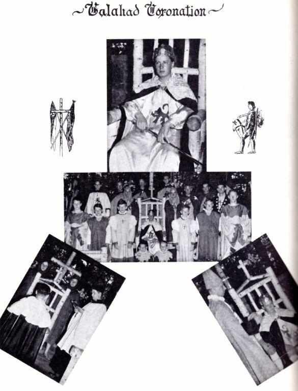 Many American summer camps have themes which are incorporated into the camp program. Today there are different kinds of camps like computer or math camp. In the 1940s, camps were more similar with a focus on outdoorf activities, but with a range of themes. At the time Native American themes were popular. And even camps that did not have Native American themes had Indian Lore activitives and handicrafts such as making mocasins. There was no Indian lore Camp O-At-Ka, but there were related handicradts. The camp theme was interesting the very English Knights of King Arthur's Round Table. Curiously back in England, we boys were more likely to play cowboys and Indians than Knights of the Round Table. (Probably in part a reflection of Hollywood's impact.) The cabin names reflected the Knights of the Round Table theme. I seem to rememeber some of the Councellors in Kinights regalia for some occasions. In perusing the camp nyearbook I find it was the Galahad, Knights of the Round Table pageant (figure 1). This was a Seniors event, and I never involved. Thus I really never learned what it was all about. It is surprisingly British for an American Summer Camp. I don't think it was very common. I don't think my brother was involved. I speculate that 'Galahad' was selected or elected as the most Community Spirited boy that Summer. I recall it was an end of Season event in the Great Hall.