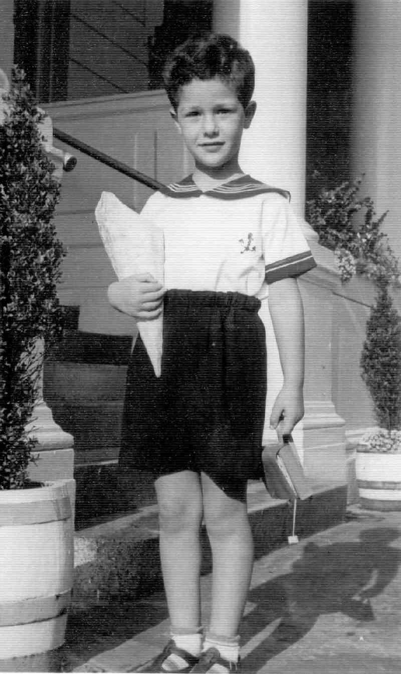 We see David off to his first day of school in 1954. Presumably this is the first day of pre-school. He would have been 5 years old here. He is wearing a junior sailor suit with dark elasticized short pants, ankle socks, and sandals. Button-on shorts were more common in the 1940s, but elasticized shorts for younger boys became common in the 1950s. The cone he is carrying looks rather German. German children received a cone full of goodies on their first day of school. We have not noted this before in England. We are not sure how common that was in England. Nor do we know what he has in his left hand. Here he looks to be in front of a house rather than an apartment building. Perhaps the family moved from the apartment.