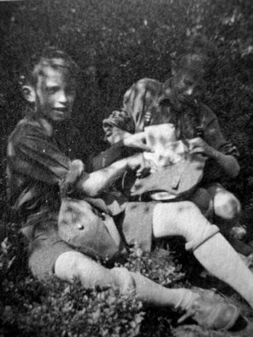 We thought it was the Hitler Youth at first because the uniforms are similar. The shirt and dark shorts as well as the belt buckle look like the HJ. The leather suspenders, however, were not like the straps worn by the HJ boys. We can't make out the colors involved, but they look similar to those of the Hitler Youth. We do not notice the boys wearing caps. And more importantly there are no NAZI insignia. We notice banners and patches that do not seem to be HJ regalia. The obly patches the boys here wear is the heraldic cross on their left sleeve. The boys commonly wear knee socks. Some boys wear long stockings, but rolled them down and wore them like kneesocks. The various photographs in the album provide us a good idea of the uniform.