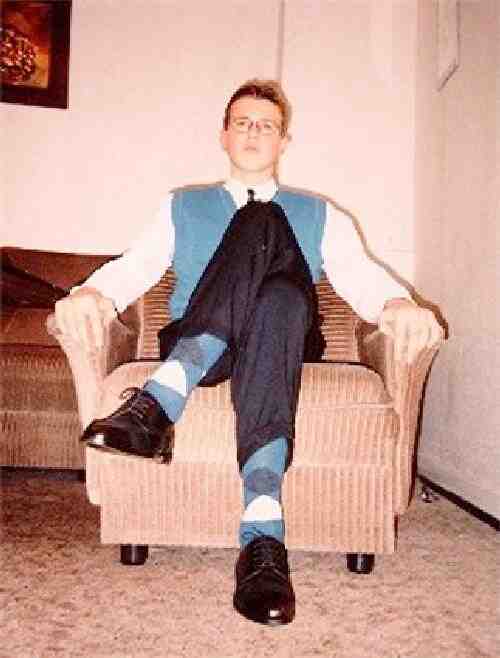 These images from winter 1996 showing me as an 14 year old teenager, wearing my typical outfit for special occasions in the Autumn or winter months. I wore a navy-blue suit with an white shirt and a matching striped tie. Over the shirt, I wore a light-blue sleeveless sweater (this kind of sweater has in Germany the misleading name Pullunder) matching the color of the square patternd socks, besides black patent-leather shoes. As a 14 year old boy I began didn`t feel unpleasant, wearing a suit. Suit were not longer commonly worn, bit iit was better than wearing short pants and kneesocks.