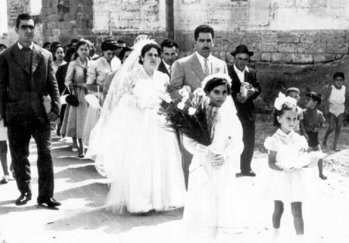 Even modest affairs often involved a procession, especially in rural villages. This custom has since World War II gradually gone out of fashion. The wedding procession ( corteo nuziale ). In some Italian villages there was the tradition of wedding parade. The bride went to church accompanied from their father. The bridegroom followed accompanied from mother-in law. We note a procession in Caprarica, in southern Italy near Bari, in 1950s or early 1960s. It is a goof example of a wedding procession. It was summertime. At the sides of parade there are village children in their "casual" clothing. Usually they are barefoot; someone just in underwear. Since late 1960s this tradition has disappeared.