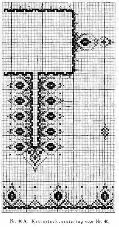 The instructiones read, "Kleine Frans' kielpakje is van afgedeelde witte stof met kruissteekversiering van rood en blauw, [the dark box is red and the crossed box is blue]. Ontwerp van Jettie de Bordesvan Alderwerelt van Rposenburgh. De dwarse gearceerde lijntjes op Nr. A aan weerszijden van het split zijn gaatjes voor het koordje. De rand onderaan loopt langs mouwtjes en kielzoom. Het losse motiefje zit op de lippen voor het ceintuurkoord. Prijs patroon kieltje en broekje 2-4 jaar 60 ct. + 15 ct." port.