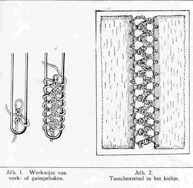 There are three figures on the magazine page for this smock. Figure 1 (Afb. 1) reads "Werkwijze van vork- of guimpehaken." This appears how to knit the decorative detail. Figure 2 (Afb. 2) "Tusschenzetsel in het kieltje." This shows how the decorative detail is worked into the garment. Figure 3 (Afb. 3) "Jongenspakje met vorkhaaksel." This is a full drrawing of how this smock outfit would look.