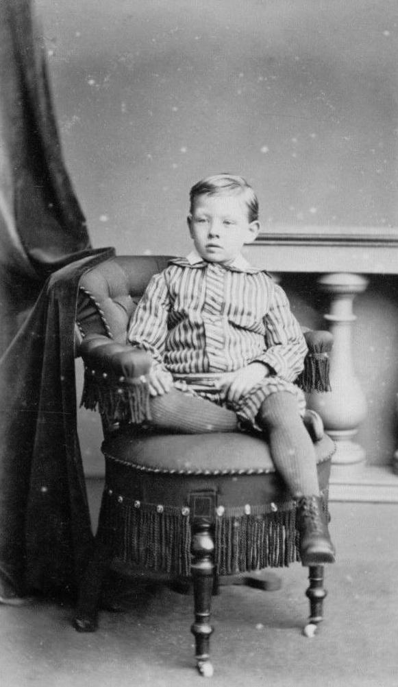 We see button-on suits with blouse tops. Jcket suits wre more common, but we do see these suits as well. These were button-on outfits looking rather like one-piece suits. The tops and bottoms mastched. Unlike skeleton suits, the buttons were often hidden by a wide waistband giving the look of a one-piece suit. We see these outfits mostly in a narrow window during the 1860s-70s. We have not found many Scottish examples, but this may reflect our limited Scottish archive more than actual prevalence. This style was a very popular style in America. We notice a Moffat boy wearing a striped mlouse suit with bloomer knickers and light-colored long stockings. Notice the double collar (figure 1). Plainer styles were popular in America. Moffat is located in the Lowlands and this may reflect English styles more than styles further north.