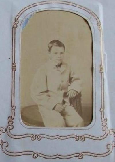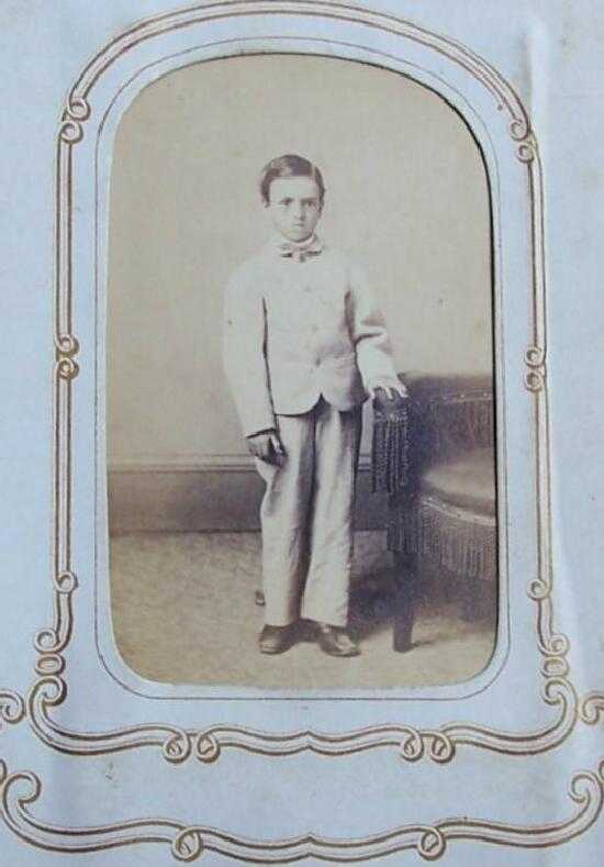The boy here looks to be about 10 years old and wears a single-breasted sack suit. Note that it is a single-breasted suit, rather than the more juvenile cit-away jacket. The jacket as a high-lapel. It is a light-colored summer suit. The suit has long pants suits, kneepants in the 1860s were still worn by relatively young boys. It looks to be a cream color. It is difficult to make out his neckwear. His hair is worn short, but not cropped. There are two portraits of him.