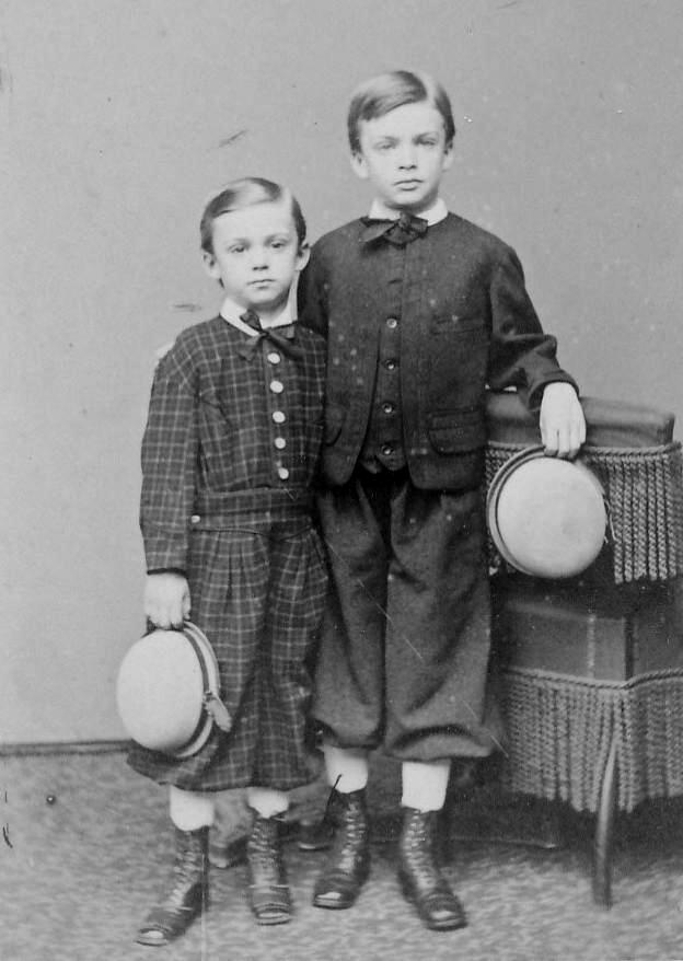 Knee pants became very common in the 1890s and became shorter. They were no longer calg length, but actually knee length. By the late-90s we see older boys wearing knee pants. Knickers were much less common. We do see younger boys wearing bloomer knickers with tunic suits that became populkae=r in the kate -1890s. Knee oants were conmoonly worn by knee oants,a t least in the cities. We raeeky see them eraring kniockers. .