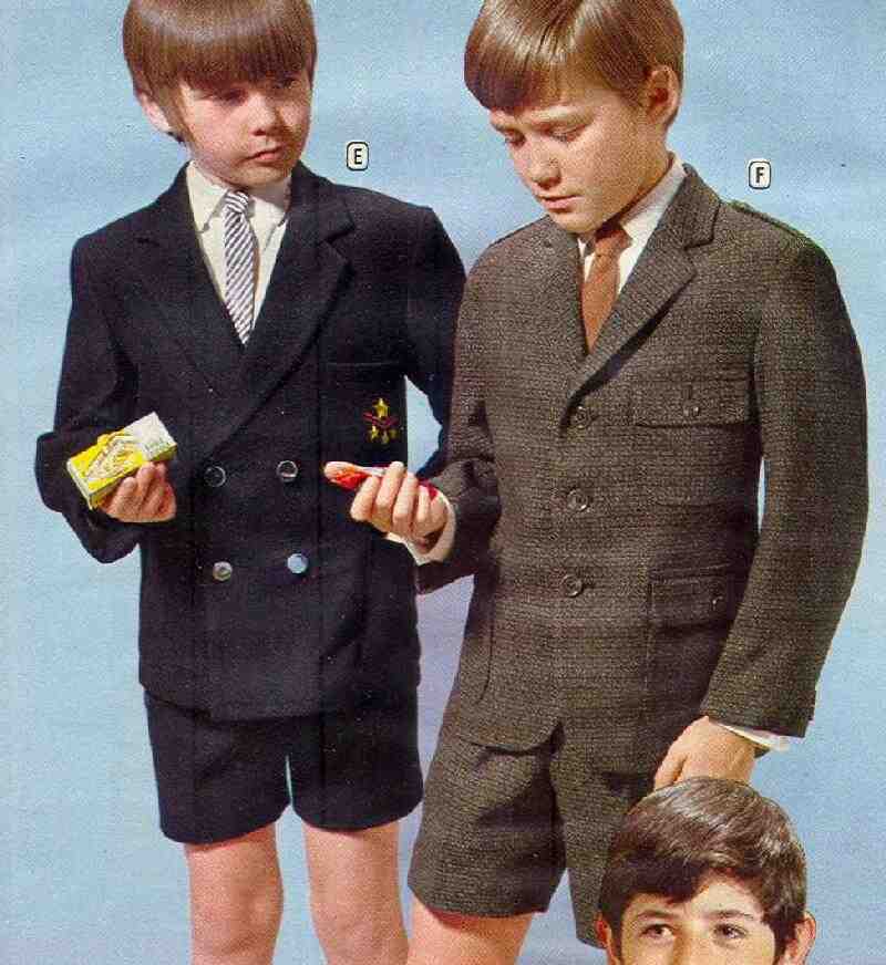 This suit has a "mod" look which we suppose is why it is described as "something different". The ad copy read, "Something different in boy's styling , a single-breaste, button-3 jacket featuring three patch pockets with flaps that button down, , two side vents, and epaulettes on the shoulders. Shorts, have half elastic back, extended waistband at the front, zip fly and slanting side pockets. The whole suit is cut from a blended Wollen material and is fully lined.