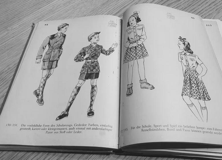 This is the Golden Schnitt oufits for older school-age boys. We see belted jackets done in different styles, short pants, and worn with patterned knee socks. A style suitable for schoolwear. The ad copy read, "Die vorbildliche Form des Schulangs. Gedeckte Farben, einfarbig gestreift, kariert oder kleingemustert, auch einmal mit andersfarbiger Passe aus Stoff oder Leder." This translates as -- The exemplary form of school jackets. The jackets were done in Muted colors, plain stripes, checks or small patterns, sometimes with a different colored yoke made of fabric or leather.