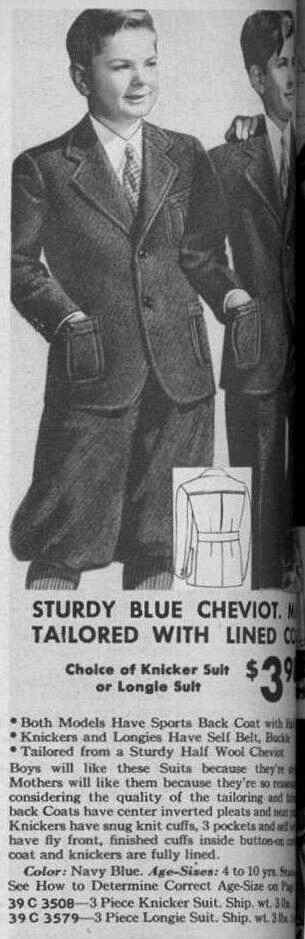 Knicker Suit or Longie Suit. $3.98. Both models have Sports Back Coat with yoke. Knickers and Longies have self belt, buckle. Tailored from a sturdy half wool cheviot. Boys will like these suits because they're stylish. Mothers will like them because they're so reasonable, considering the quality of the tailoring. The Sports back coats have center inverted pleats, and the knickers have snug knit cuffs. Three pockets. All have fly front, finished cuffs, inside buttons (for suspenders? for buttoning to a blouse? for attaching to an underwaist?). The coat and knickers are fully lined. Color: Navy