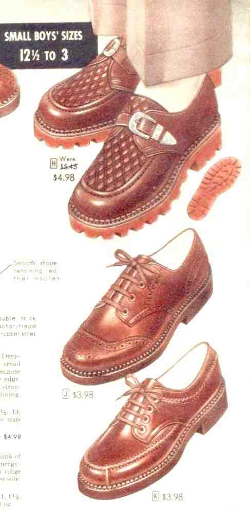 The tractor sole was the destinctive feature of this shoe. I'm not sure just how the vamp was done. The Sears ad copy read, "Lower price for spring! Deep-cleated red rubber tractor-tread sole, heel; super quality because tread comes clear out to sole edge. Strong leather. Adjustable strap. Smooth leather insole, heel lining. Sewed construction." It was done in brown.