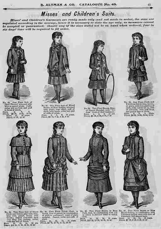 At this time HBC does not know the date of this catalog, but believes it was the early 1880s, perhaps late 1870s. These skirted garments are probably referred to as suits because they had jacket like garments which were made in the same material as the skirted part of the garment. Curriosly, outfits for two different age groups are mixed on this and two other similar pages. Altman on page 45 offered skirted suits for two age groups, 4 to 12 years and 10 to 16 years. Note the overlap between the sizes. The younger children's styles have shorter skirts and more recognizeable jackets. Most of the younger children's suits are worn with large, but not huge floppy bows. The suits are mostly dark colors, primarily brown, blue, and gray.