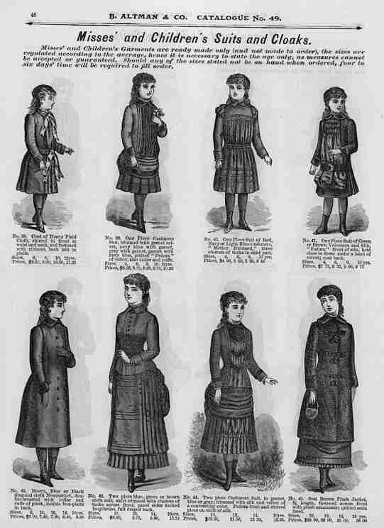 At this time HBC does not know the date of this catalog, but believes it was the early 1880s, perhaps late 1870s. These skirted garments are probably referred to as suits because they had jacket like garments which were made in the same material as the skirted part of the garment. Curriosly, outfits for two different age groups are mixed on this and two other similar pages. Altman on page 46 offered skirted suits for two age groups, 4 to 12 years and 10 to 16 years. Note the overlap between the sizes. The younger children's styles have shorter skirts and more recognizeable jackets. These suits are mostly dark colors, primarily brown, blue, and gray, but there are also some lighter, brughter colrs offered.