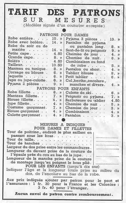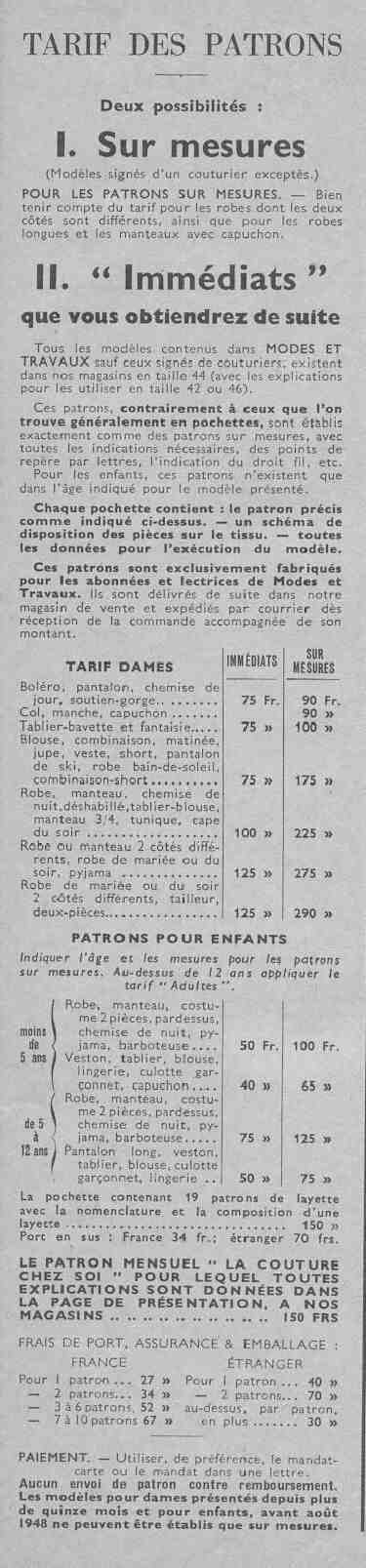 HBC has extensively used French sewing magazines to illustrate fashion trends and annual styles. Readers might be interested on how mothers ordred patterns from these magazines. Mothers every week found sewing children patterns in Modes et travaux. The patterns were included in standard sizes for the mothers subscribing to the magazine. For others sizes, they could be purchased for the list price. Each illustration in the magazine was numbered. Using that number, a pattern could be ordered by mail. The person ordering the pattern specified the size. The prices for the patterns varied somewhat from the prices indicated in the description next to the illustration. There was a suecharge for special sizes (sizes different from the size specified with the text/ad copy describing each illustration. Here are some details on how patterns were ordered from Modes et travaux. The procedure for other magazines was similar.
