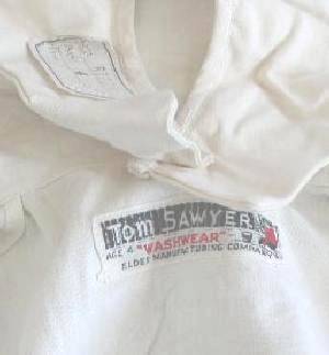 The factory cloth tag reads Tom Sawyer Age 4 Washwear Elder Manufacturing Company. There is also a sewn on paper label that says Lot R111 Age 4 and place for price which is not filled in.