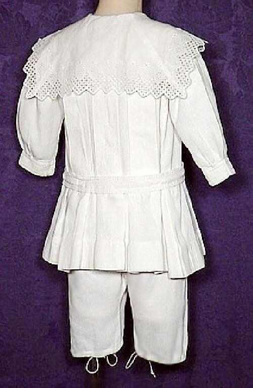The fancy juvenile suit here consisted of a tunic and matching knicker-length pants designed to be worn bloused out in bloomer fashion. The tunic itself is shorter than many tunics we have seen. It looks to be well aove the knees and does not ciover the pants--although this maybe because a boy is not modeling it and it on a dummy. The tunic looks to have half sleeves that covered the elbows, but did not extend all the way to the wrists. The wrist cuff looks to have been doubled, but we do not notice any lace trim. The tunic had a dicky in matching material with minimalI horizontal embroidery. We had thought that the boys wearing bloomer-leg pants had elasticized lgs. But drawstrings may have been more common. This suit had a 30" loose fitting chest and waist, 10" from shoulder to shoulder, 19" from shoulder to hem, and an 8" inseam.