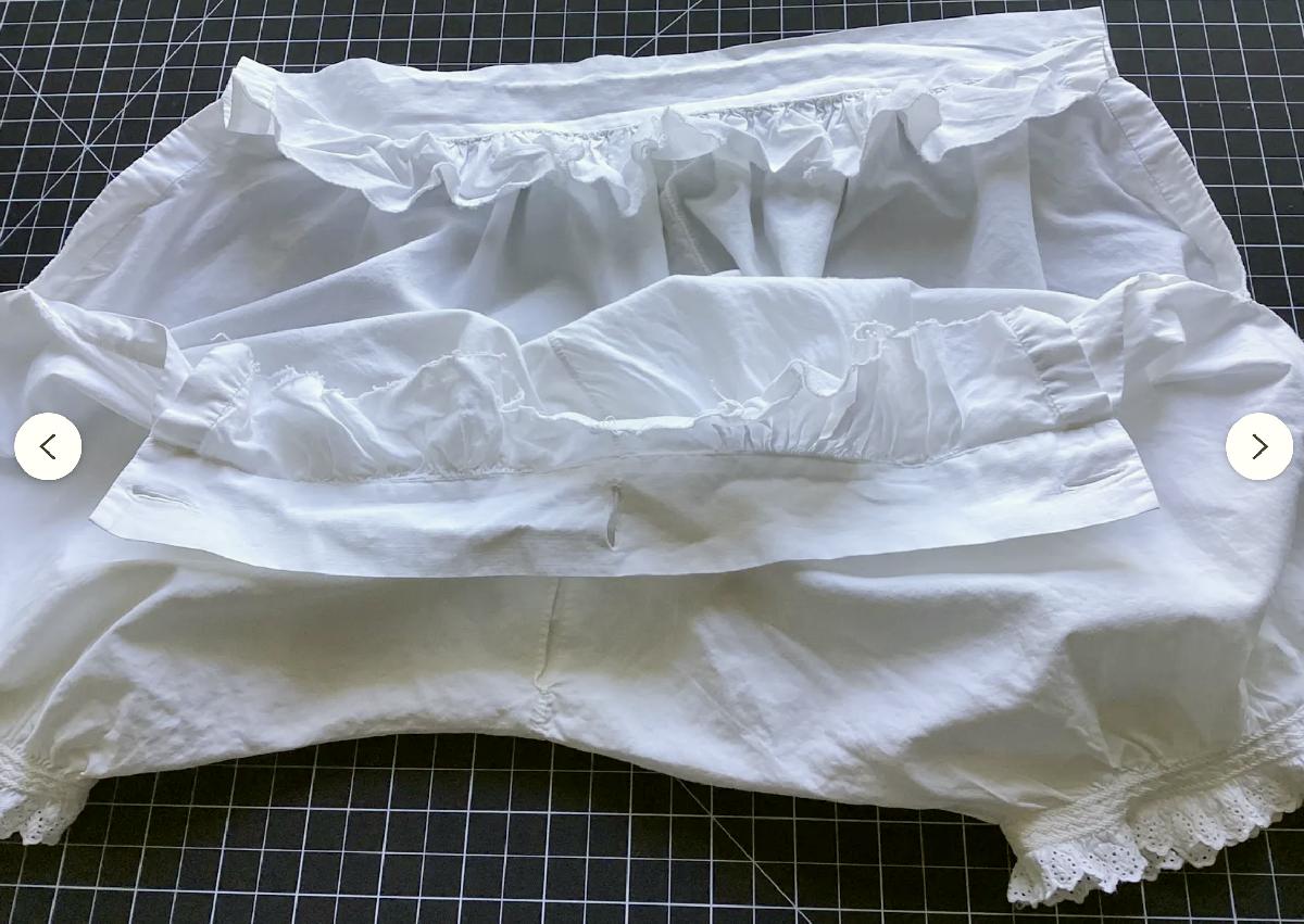 Vintage clothing is especially imprtant in dealing with underwear. Underwear s of curse covered up in the photograpgic ecord. A HBC reader provided us scans of American boys underpants worn about 1900, although the date is just a guess. The garment of course is undated. What is interesting is how completely different and more complicated underpants were from modern underwear. This made getting dresses much more complicated for children, especially younger children, than is the case today. Getting dressed must have been a bit of an ordeal for younger children before elasticized waist underpants were available (1930s). We think the 25 inch waist here equates to something like a modern child 6-8 year old. The underpants had a fly so we know they were suitable for boys. Although this is so basic, these pants seem suitable for both boys and girls. Notice the button holes, but lack of buttons. These underpants would have buttoned to a waist (underwaist or panti-waist hence the name). These waists were very common garments into the 1930s. We are a little unsure about the fact that there are only buttonholes in the front. We expected to find both front and back button holes. A HBC contributor offers this explanation, "This is my guess: The back probably worked like a drop seat with some way to use the waist side buttons to hold the front and the back. You attach the front first and then the back to the same buttons so you can unbutton to relieve yourself. I suspect parents did that the most." I can recall as a 6 year old having trouble learning to tie my shoe laces. I can't imagine having this looming disaster looming over my head.