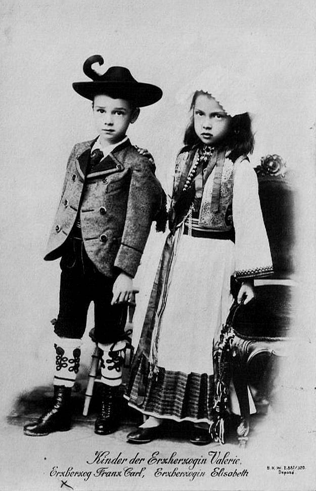 Arch Duchess Marie Valerie and Franz Salvatore first son was Archduke Franz Karl Salvator. He was born in Lichtenegg in Lower Austria (1893). He was the royal couple's eldest son. We note Archduke Franz Karl Salvator along with Archduchess Elisabeth Franziska . The portrait shows them together in what we assume is Austrian folk dress, basically peasant dress. This was very popular with Austrian royals. We note Emperor Franz Josef in similar garb with his son Ruldolf, decaded earlier. The portrait was taken by Adèle, Vienna, Austria. The children look to be about 9-10 years old which means it was taken about 1902. He did not marry and had no children. Franz Karl was of military age, but we have no details on what he did during World war I. He died very young, only a few weeks after the end of World War I (1918). We are unsure as to the circumstance.