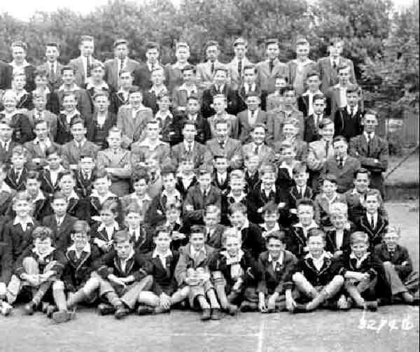 Most all of the junior boys in 1950 wear the school blazer, but only a few of the senior boys have them. I'm not sure why that was. We are not sure why that was. Perhaps the blazers were hard to obtain. Perhaps the boys didn't like them. Parents may have insisted that the younger boys wear them. It was considered an important accomplishment for a child to have done well and earned a place in a grammar school. Then again we are not sure what the policy was when a grammar school was the only secondary school in town. Perhaps the school was no selective. This presumablyis why the school is coeducational. As far as we can tell, the school did not require the blazer be worn, even for the junior boys. Most boys wear ties, but we note a few with open collared shirts. Many of the junior boys wear short trousers. It does not seem to be all the junior boys. This suggests that it may not have been a school rule. The boys in shorts wear grey kneesocks. Only a few seem to have the colored stripes. The girls wear gym frocks with ties which was a seasonal uniform, but may have been adopted year round. Unlike some schools, few girls seem to wear the blazer. The girls wear short white socks with a variety of shoes.