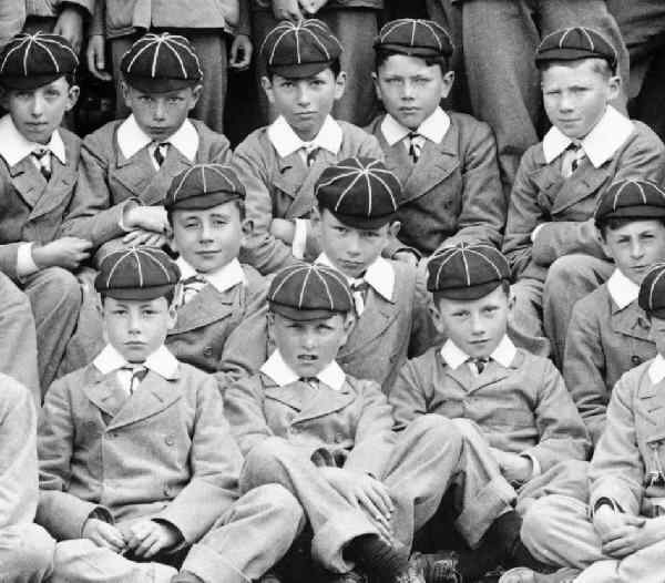 Figure 1.-- The portrait is interesting in that all the boys are wearing the same identical suits, or virtually all. The jackets vary slightly, but all the boys wear long trousers with very wide cuffs. This was not that common at prep schools at the time. |