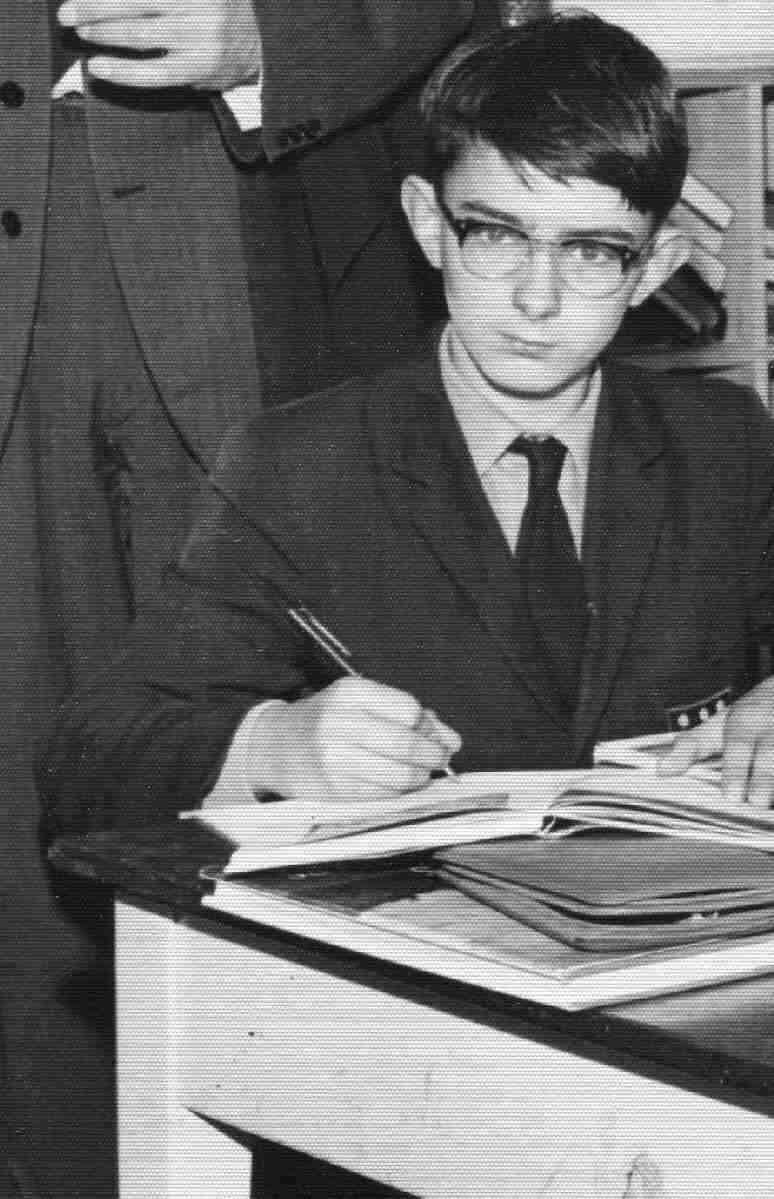 Having passed the 11-plus exam, in September 1962 I moved to the local (public-sector) grammar school. This was a fairly recent school - opened in 1954 - and coeducational. At my new grammar school we wore dark grey trousers, dark green blazers with a coat of arms on the breast pocket, and grey shirts with a plain maroon tie. As before, in cold weather I wore a pullover - green to match the blazer - under it. Grey socks and black lace-up shoes (worn indoors and out) completed the uniform. At that stage, navy-blue gabardine raincoats were generally worn but later other dark blue to black coats became more common. For the first few years I was there, caps were worn (sometimes) to and from school. In hot weather, we would ask permission to take off our blazers in class and roll up our sleeves - permission was definitely required, but most teachers were reasonable about granting it. In the sixth form, we wore white shirts rather than grey, and in the upper sixth, dark blue blazers rather than dark green, with a more elaborate version of the coat of arms on the breast pocket. When it was cold, I wore a blue pullover under the blazer. For a few classes we needed protective clothing of some kind. For PE and games, boys and girls were distinctive outfits. Our PE and Games kit consisted of white cotton PE shorts, navy blue games shorts, two rugby shirts (one green, the other white), white plimsolls, white ankle socks, coloured rugby socks, rugby boots and a white sweater. We also needed a towel. There were rules about what we were to wear and when. Inevitably the theory and practice of PE kit differed. I never wore the white ankle socks (twenty years later I gave them to my wife!): in fact, I very rarely wore any socks at all with plimsolls - I found them more comfortable without, and in the winter I put comfort before warmth.