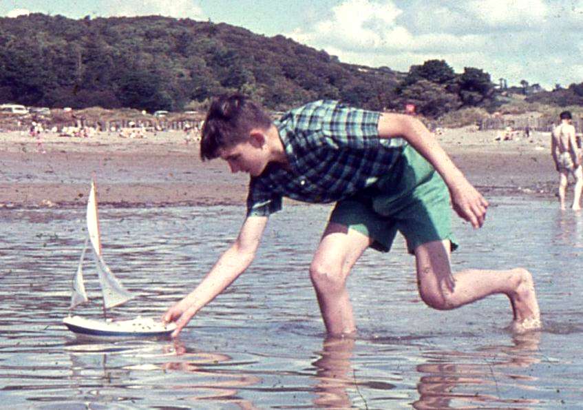 Here we are on holiday in Cornwall again (August 1964). Still the same green shorts, but I've started growing at last! I'm sailing a boat in a tidal pool created by the sandbar across Porthluney Cove.