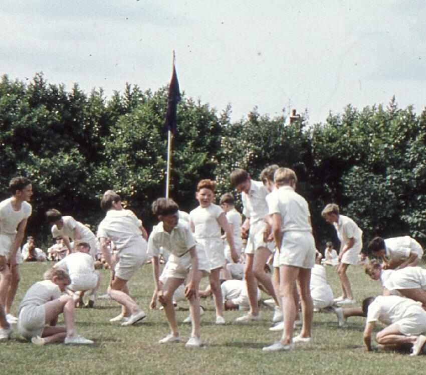 For PT (as it was known there) indoors we changed into white plimsolls and removed our blazers and ties. In the summer we would normally be outside, for which we changed into white shirts (either button-up or t-shirts) and shorts, and wore plimsolls without socks. On (I think only) one occasion we were all told to strip to the waist, which I found very strange, but this was not normal practice. I don’t ever remember anyone doing PT barefoot. Games in the winter was football (soccer) for which we wore navy-blue shorts, football shirts in either white or the school colours, school football socks and boots. In the summer we played cricket, for which we wore much the same as for summer PT, but with white socks. Underpants were permitted, but not vests: the coloured football shirts were horribly scratchy on bare skin, so that I eventually persuaded my mother to line mine! The length of the PT shorts was quite variable, and latterly some boys wore them well above the knee, while others wore them little shorter than the gray shorts.