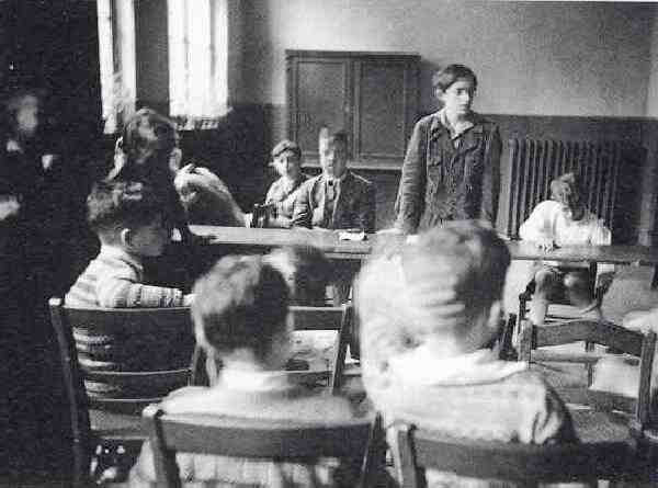 I'm not sure what is gouing on here. I thought that it might be a class debate. A German reader writes, "I think the boy is likely reciting or explaining something, as it was common in Germany until the 1960s to stand up when called on by the teacher." HBC would agree if the class was in a standard arrangement. But here the students are not sitting at their desks in a classroom. Rather there is a table with some of the students including the speaker and the rest of the children are in chairs (not desks) listening to the boys in front at the table .