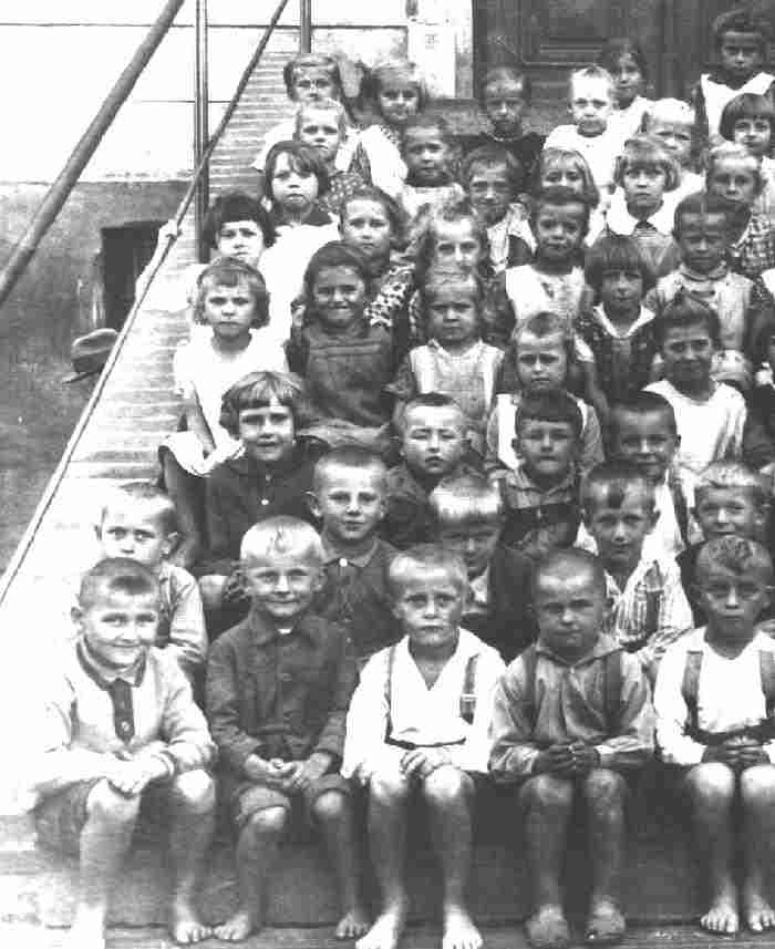 We have a photograph of the younger boys in 1925. The boys in 1925 mostly wear collared shirts. We see both white and colored shirts. Most are buttoned to the collar. One boy wears a polo-stule shirt. The boys wear short pants, many with suspenders. . One boy wears kneesocks, but most boys are barefoot. Some boys seep to be wearing inexpensive cloth shoes.We note one boy wearing fancy H-bar traps, but most wear suspenders. Many of the girls wear pinafores. Many boys have close-cropped hair.