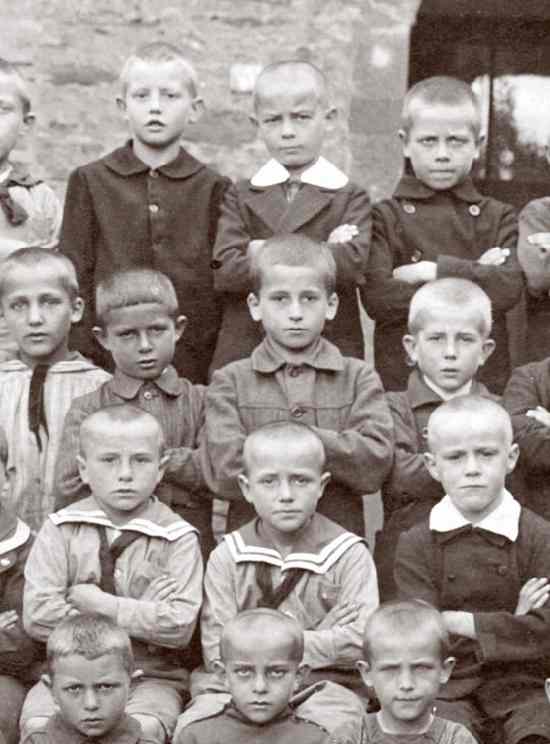 These boys have very severe hair cuts indeed. Most of the boys had either very close-cropped hair cuts or bangs. We only notice one boy that has enough hair for a part. The boys here in many instances do not seem to have just close cropped hair cits, but some boys seen to have shaved heads. We wonder just how their hair was cut. Such severe hair cuts must have required at least weekly clipping. We winder if some boys actually had their hair shaved. Presumably this woud have been done by their mothers.
