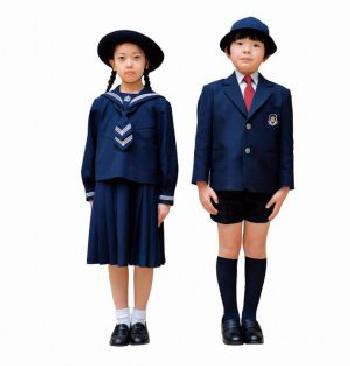 St. Joseph has a traditional winter and summer uniform. The boys wear an English stylw unifom except for the headwear (figure 1). The Winter uniform has the standard soft hat worn at many Japanese schools. The uniform including the hat is all navy blue. This includes the hst, blazerr, short pants snd knee socks. This is worn with a white shirt and red tie along with black leather shoes. The sailor unifornm was adopted from the British Royal Navy in the late 19th century and with many variations is worn by girls today. This is especially the case in secondary schools and private schools. Unlike many elementary schools, the girls have a differet hat, this one vhas a wide brim. The sailor dress (or blouse and skirt) is dark blue with stripe detailing and a scarfe with cheverons. The girls wear white ankle socks and black leather shoes.