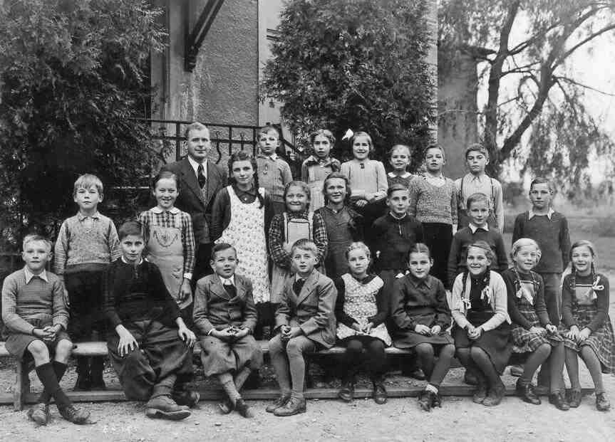 This is a group of what looks like fourth year students, probably about 10 years old. The photo was taken on October 26th, 1944 Since it is late October, chilly but not yet really cold, we see a variety of trousers for the boys. In the front row, for example, two of the boys wear baggy knickers and knee socks, one boy wears shorts with black knee socks and therefore has bare knees, and the most dressed up of the boys wears a neat short trousers suit with brown long stockings. The girls mostly wear pinafores with dresses or skirts and sweaters and all wear long stockings, either black or dark brown. The teacher is Herr Ernst Haartmann, wearing a white shirt with a suit jacket and sweater underneath. One of the boys with baggy knickers wears hiking boots with ankle woolen socks turned down over them, but nearly all the other children wear low-cult leather dress shoes. One of the girls also has ankle socks on top of her dark brown long stockings. Notice the boy in the back row on the right who wears elastic suspenders, probably with shorts and long stockings, but perhaps with knickers.