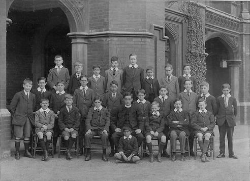 Lace and ruffled collars are not generally thought of a a boys' school garment. But in fact in the late 19th an early 20th century, many yonger school boys did wear lace and ruffled collars. We note this in England, America, and continental European countries as well. At the turn of the 20th century, we note classes with boys wearing both lace and ruffled collars and Eton collars. Boys in the same shool a yer or two older would almost all be wearing the Eton collars.