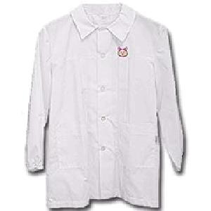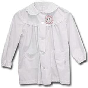 The ad copy for this smock reads, "Grembiule bimba da asilo realizzato in puro Cotone, resistenti ai lavaggi e antimacchia. Modello con pinces al petto e ricami, con colletto bianco ricamato, chiusura a bottoni, elastico ai polsini e taschine. Colorazione tinta unita bianco. Toppa sole." This translates as, "Girl's smock from [?asylum] made in pure cotton, resistant to washings and soiling. Model with [?pinces] to the chest and embroidery, with embroidered white collar work, button clpsing , elastic to [?polsini] and the [?taschine]. Color solid white only. [?Toppa] sun." This is another girls' smock with styling similar to the ones above, but in white.