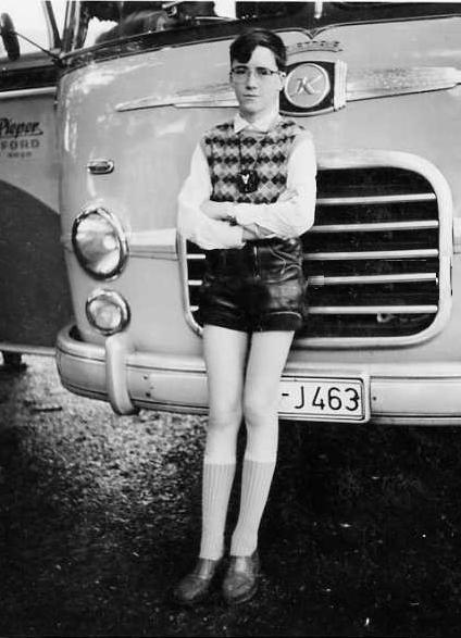 Lederhosen means leather pants, it means nothing about length. They are made in two basic lengths, short pants and below the knee knickers length. The knickers or Bundhosen length Lederhosen not only extended below the knee, but had closures of some kind, such as buttons. Some shorts pants Lederhosen were quite long, but had no closures. While these are the two basic types of Lederhosen, the short pants type come in many different lengths. Here there seem to be two factors involved. First was the popular fashions of the day. We notice knee-length Lederhosen in the 19th and early 20th century whern short pants were either not commonly worn or very long. We begin to see shorter cut Lederhosen in the 1930s when boys began to wear shoerter-cut shorts. This was much more the case in the 1940s. And in subsequent decades the length of Lederhosen followed the popular length in which other short pants were worn. The second factor is age. Lederhosen are not cheap. Mothers commonly brought a large size. The halters commonly worn with them could hold them up. They had a cuff like arrangment that could be turned down as the boy got taller. As Lederhosen were vurtually indestrutable, boys commonly wore them for years. Thus older boys with Lederhosen bought a few years earlier would be wearing pants much shorter than when they were first purchased.