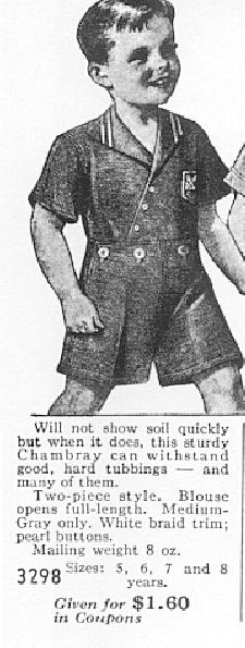 HBC notes that sets of shirts and pants styled rather like regular garments appeared in the 1930s. Often they had self-belts. This was very common n America. We are less sure with Europe. We see these into the 40s, but not with the large white buttons that we saw wih the Oliver Twist suits. They were made with both long and short pants. Button-on sets were more commonly shorts sets, but HBC has noted longs as well. Knicker were less common. They were often made for play, but also worn to school. They were comonly called wash suits because they were easly laundered. All the major mail order companies had a selections of these outfits. Sears and Wards always had a good selection, but they were offered by other companies as well. Larken offered a military-styled button on suit for boys 5-8 years of age. Many photographs of younger boys at school show them wearing button-on styles. A good example is nursery school in 1934. Button on-styles were also worn by the younger boys in primary grades. An English reader writes, "I am only aware of buttoning on pants being used with boys just out of babyhood. I have one photo of me like that in the very early 1930s and nothing after that in my experience."