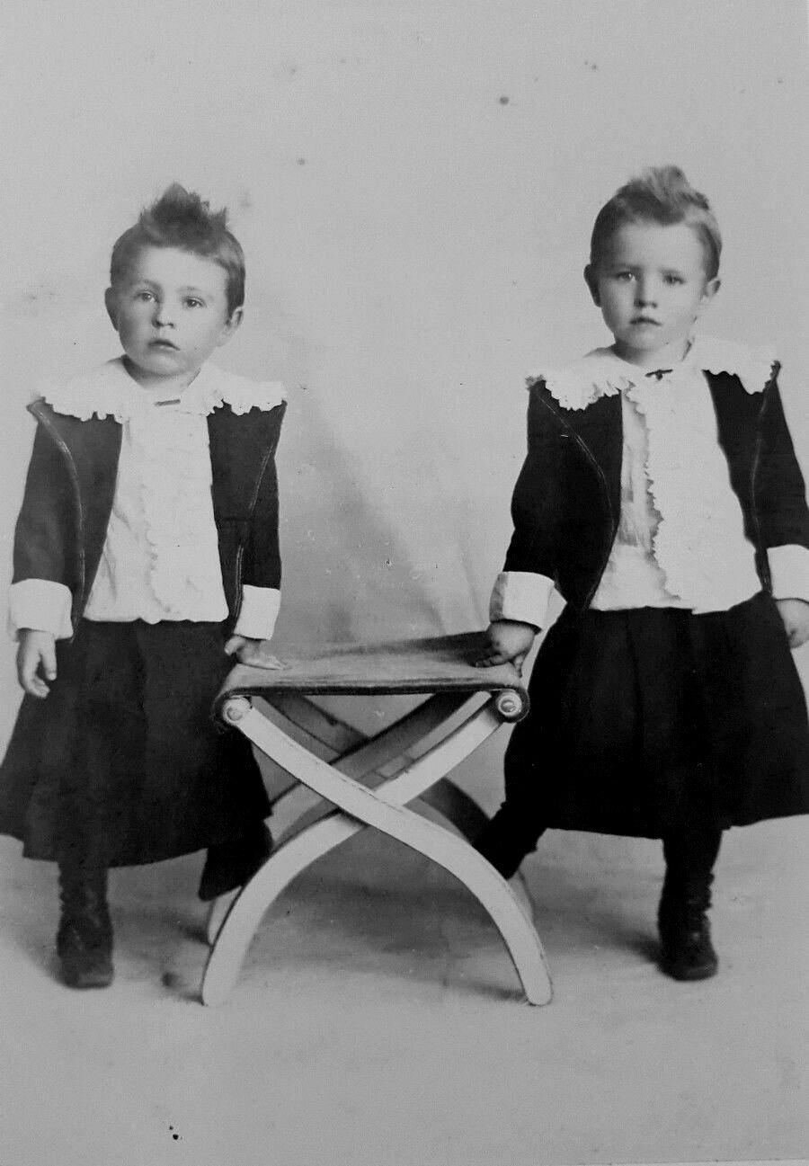 We have found most of our exmples of Fayntleroy kilt suits from the 1890s. We see cut-away jackets and fancy Fauntleroy blouses. We have found both pleated and unpleated kilt-skirts. We note a Pennsylvania boy, Freddie Miller Shelton wearinf a velvet Fauntleroy kilt suit, probably about 1890. The mount pinking dates the portrait to 1888-95. Freddie was 5 1/2 years old. He wears a classic cut -away jackets with a matching kilt skirt. Notice the buttons in the kilt-skirt. Another good example are unidentified Kansas brothers in 1895, again with dark kilt skirts (figure 1). The boys look to be 3-4 years old. This seems more common than the plaid kilt-sirts we sometimes see.