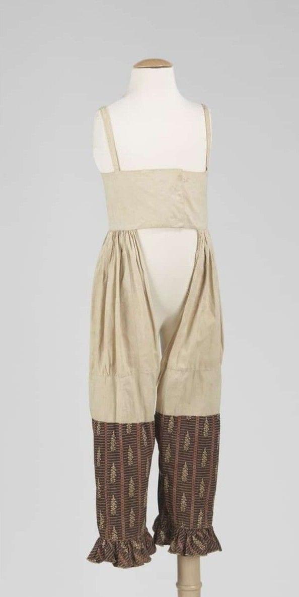 We believe that pantalettes were normally one piece garments with pants/trouser like construction--hence the name pantalettes. We think this was the case for the shorter-length pantalettes before dress hem lines began to rise. And when the pantalettes were white rhey were almost always done in cotton or linnen. But not all pantlettes were white. Some in fact were done in the same material as the dress. Here we might see faux pantalettes. Here we have no photographic evidence. Photography did not appear until the 1840s. And even when photography did appear, girls were of course not photographed without their dresses. Now there may be paintings illustrated this, but if there are, there are mot very many and we have not found them. But there is one useful source--vintage clothing. There is not a lot of it for the early-19th century, but examples do exist in museum nd private collections.